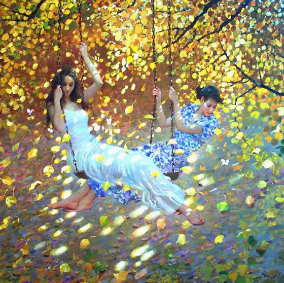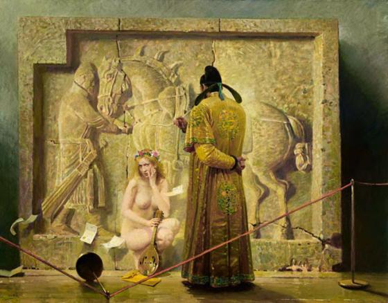 Họa sĩ 66 tuổi người Trung Quốc thường vẽ các cô gái phương Tây với đồ gốm; vị quan phong kiến với thiếu nữ khỏa thân hay đối thoại giữa cô gái tóc vàng với bà hoàng Trung Hoa.